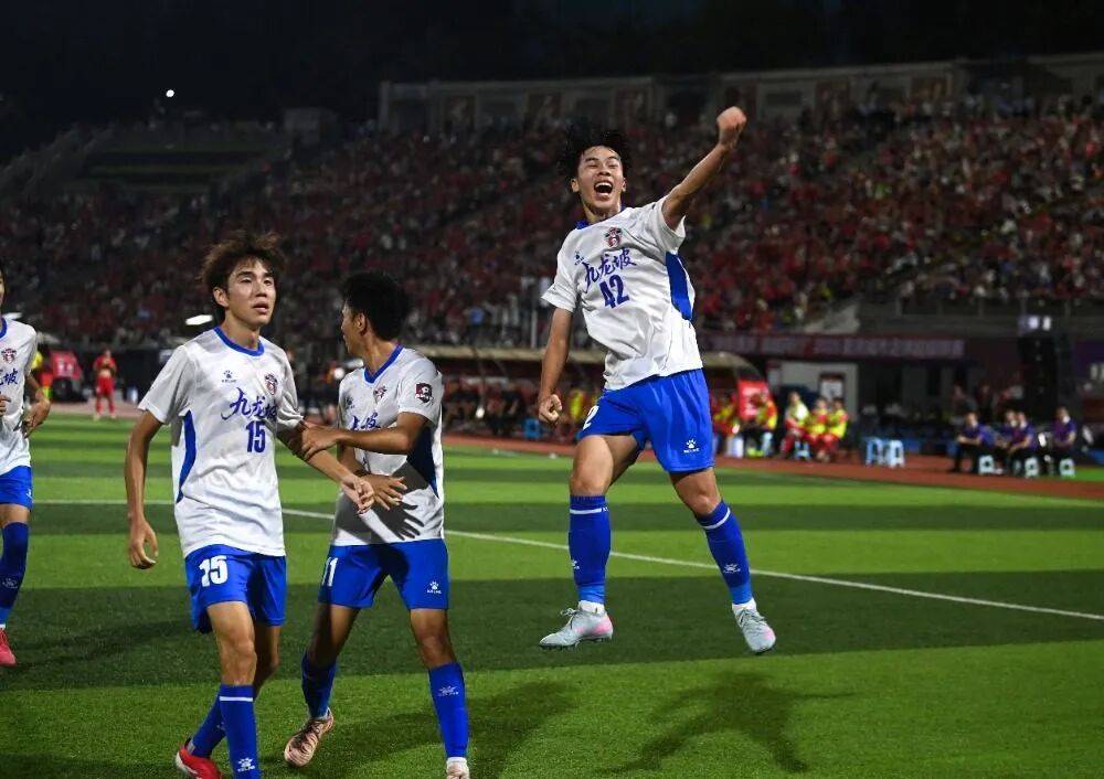 ▲9月13日,渝中区大田湾体育场,“渝超”揭幕战中,九龙坡队庆祝进球。记者 郑宇 摄/视觉重庆