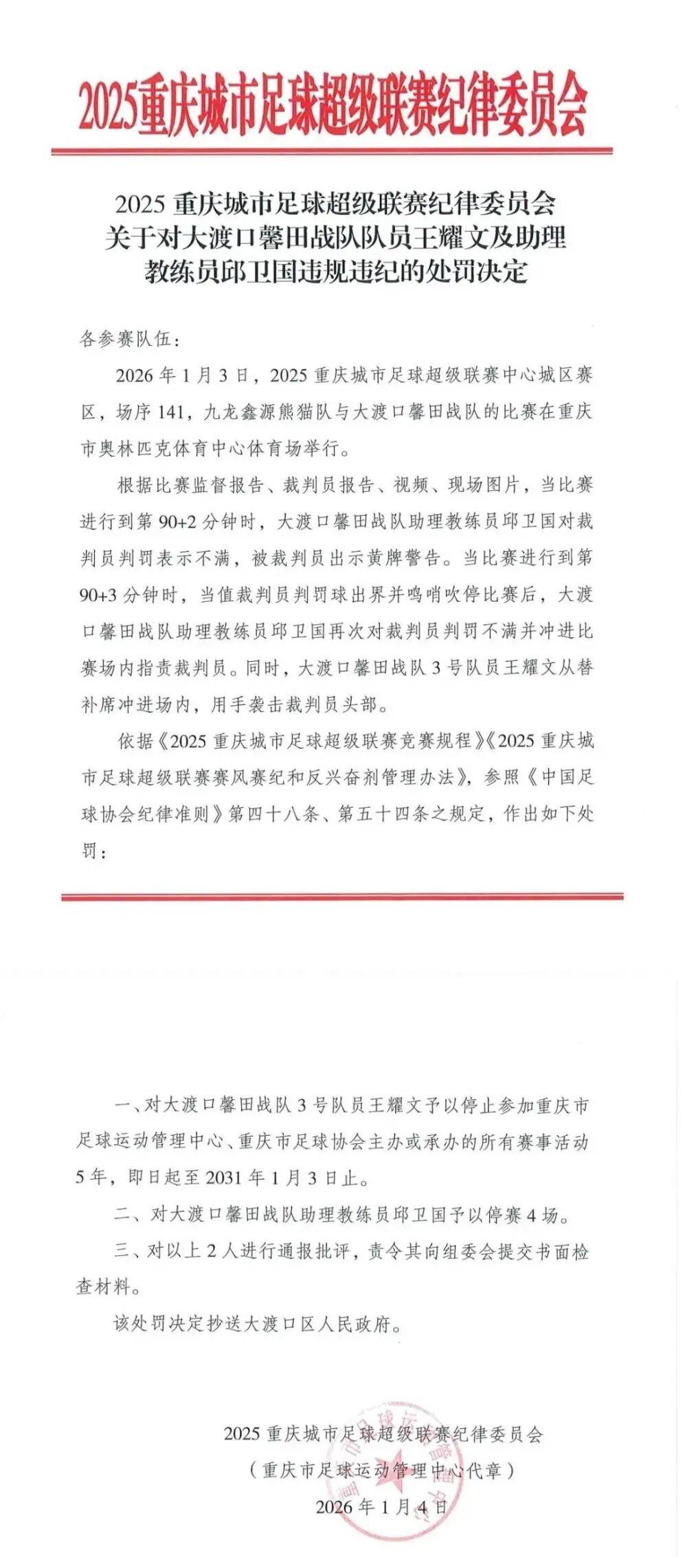 决定称,依据《2025重庆城市足球超级联赛竞赛规程》《2025重庆城市足球超级联赛赛风赛纪和反管理办法》,参照《中国足球协会纪律准则》第四十八条、第五十四条之规定,作出如下处罚:对王耀文予以停止参加重庆市足球运动管理中心、重庆市足球协会主办或承办的所有赛事活动5年,即日起至2031年1月3日止;对邱卫国予以停赛4场;对以上2人进行通报批评,责令其向组委会提交书面检查材料。