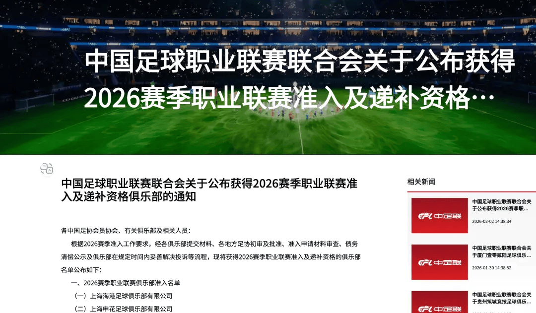 根据2026赛季准入工作要求,经各俱乐部提交材料、各地方足协初审及批准、准入申请材料审查、债务清偿公示及俱乐部在规定时间内妥善解决投诉等流程,现将获得2026赛季职业联赛准入及递补资格的俱乐部名单公布如下: