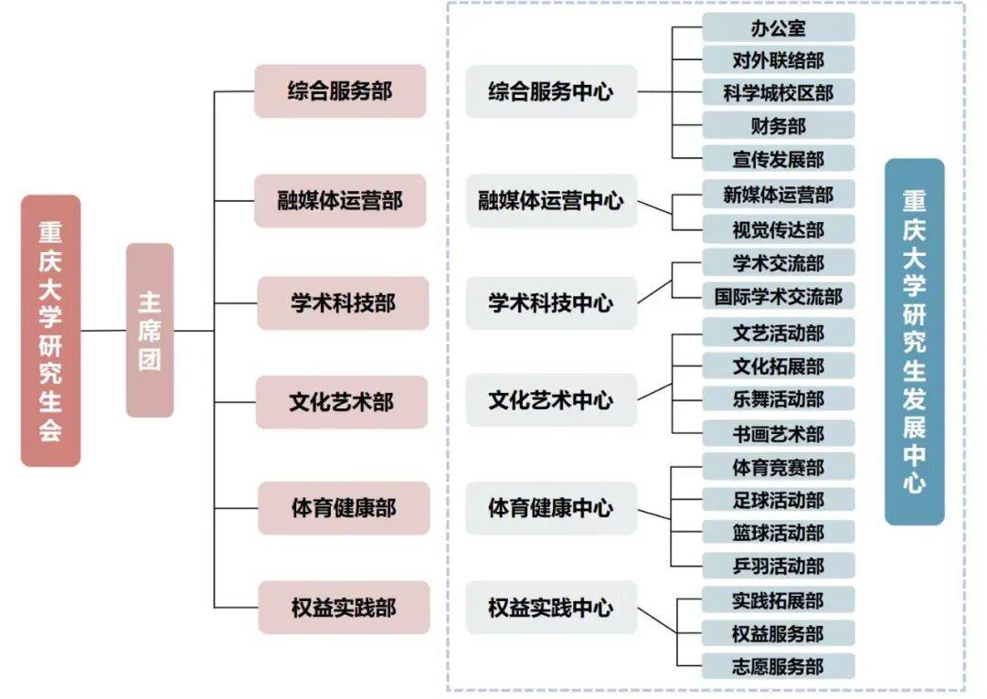 重庆大学研究生发展中心设有综合服务、融媒体运营、学术科技、文化艺术、体育健康、权益实践六大中心。六大中心下设20个职能部门,与研究生会各部门协同开展工作,共同构建服务同学、助力发展的育人平台。